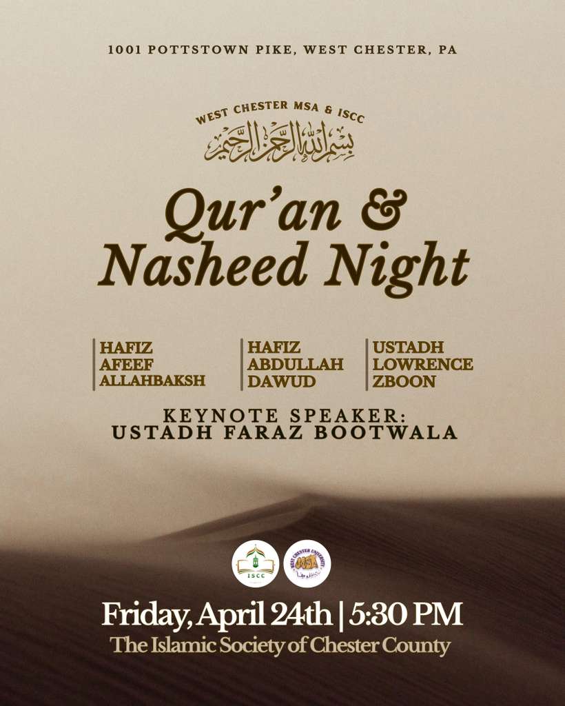 We invite you to join us on Friday, April 24th, for a Qur’an & Nasheed Night! Join us for a peaceful evening of Qur’an recitation and uplifting nasheeds. A night to reconnect spiritually and spend time with community. We’ll have a coffee cart and food vendors!